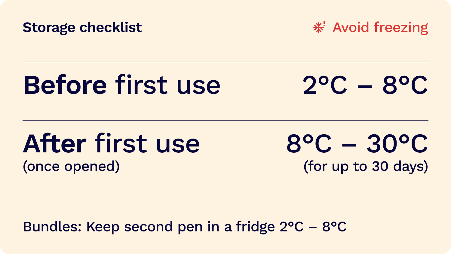 If you have purchased a bundle, please remember to keep your second pen in a fridge (2°C to 8°C) until its first use, even if you have begun using your first pen.